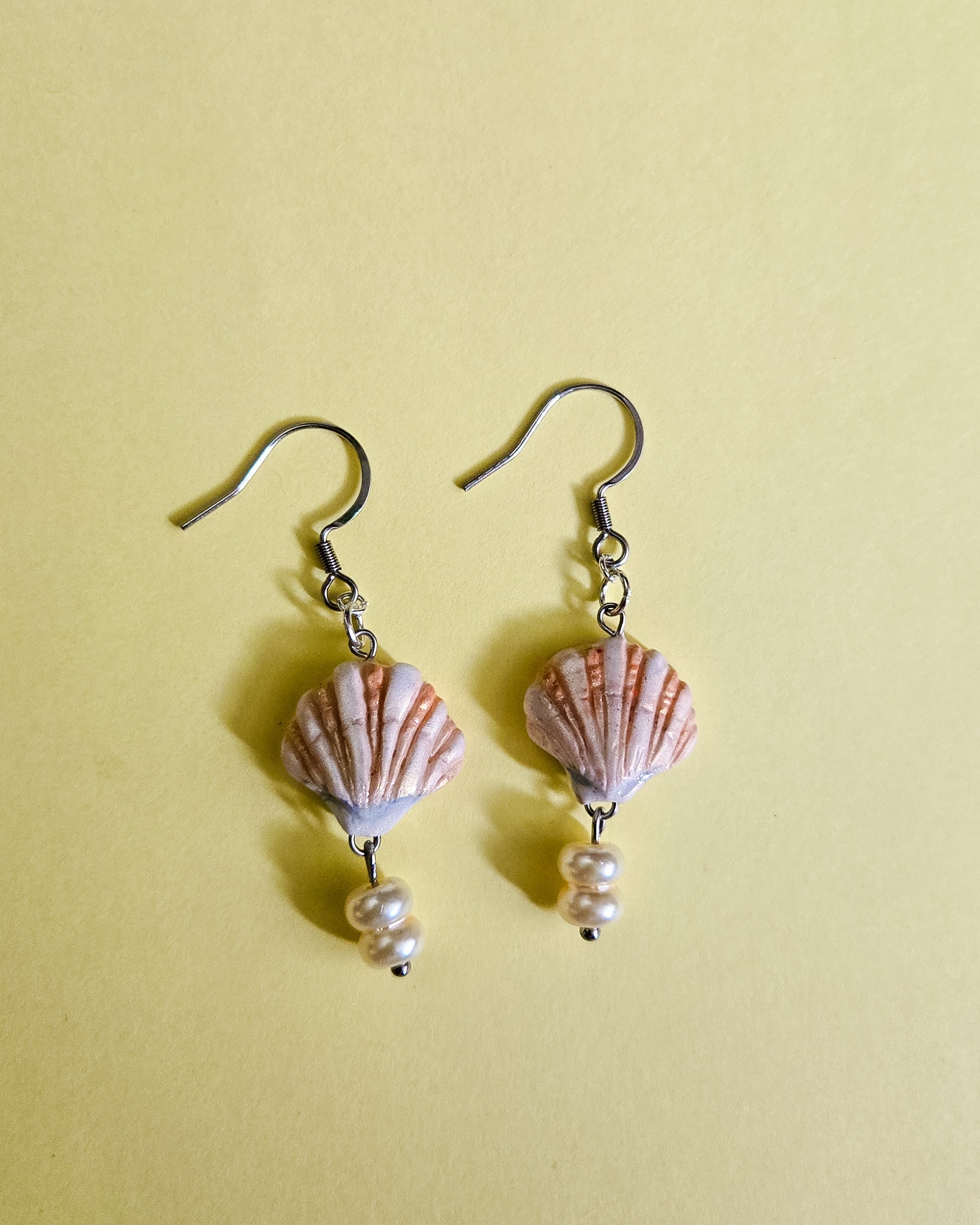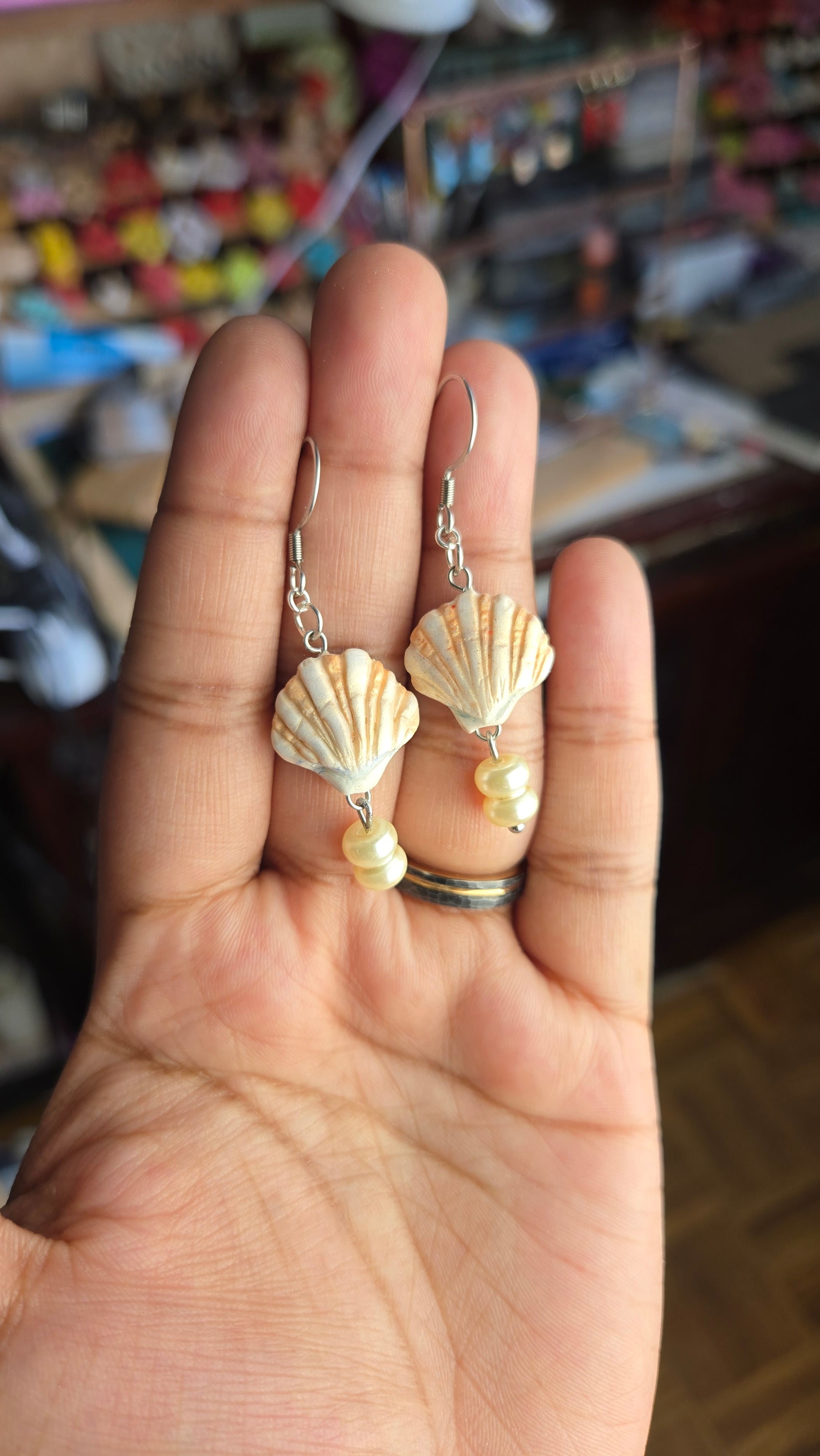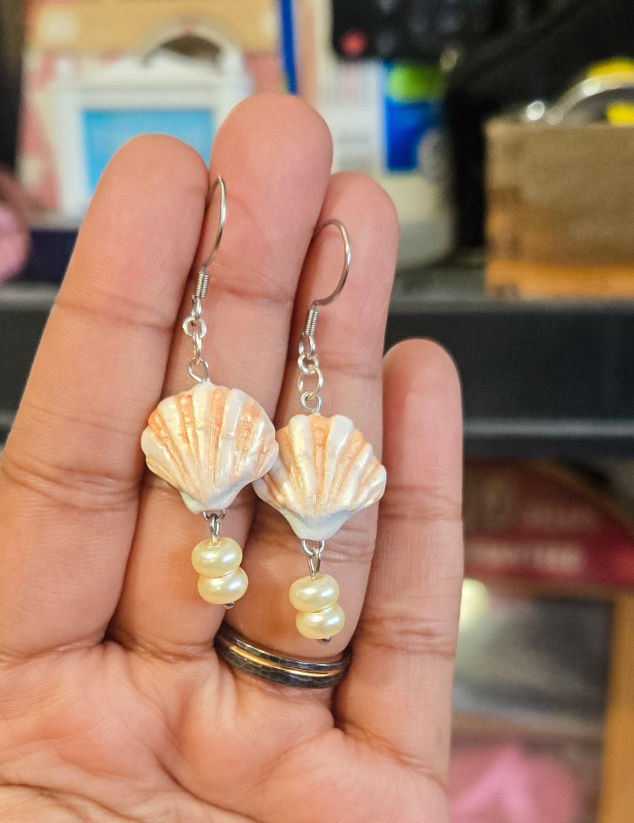 Handsculpted and handpainted seashells with freshwater potato pearl beads. Glossed with a varnish to protect the shimmery pigment on the seashells.